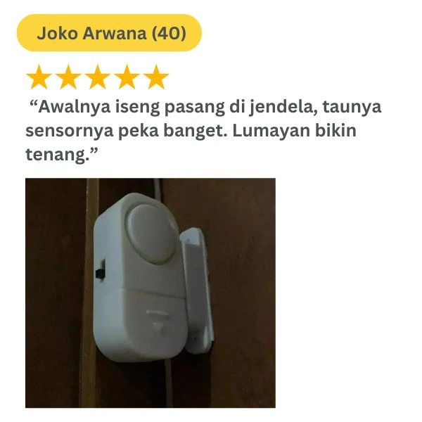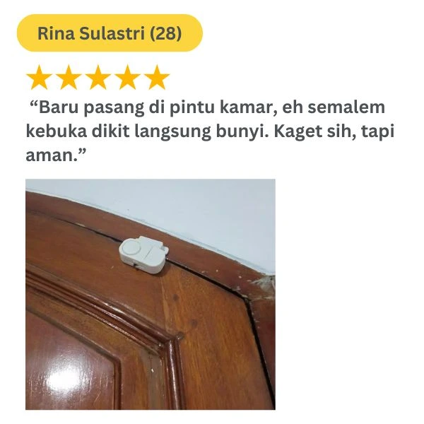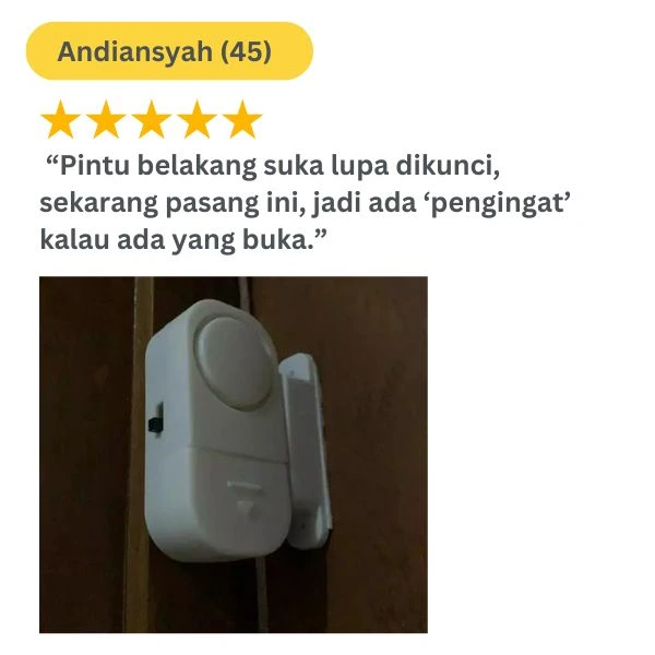 Tidak merusak pintu cukup di tempelkan pake double tip yang sudah tersedia atau terpasang pada alat ini. Alarm memiliki kekuatan suara sangat keras, hingga membuat panik para pencuri.