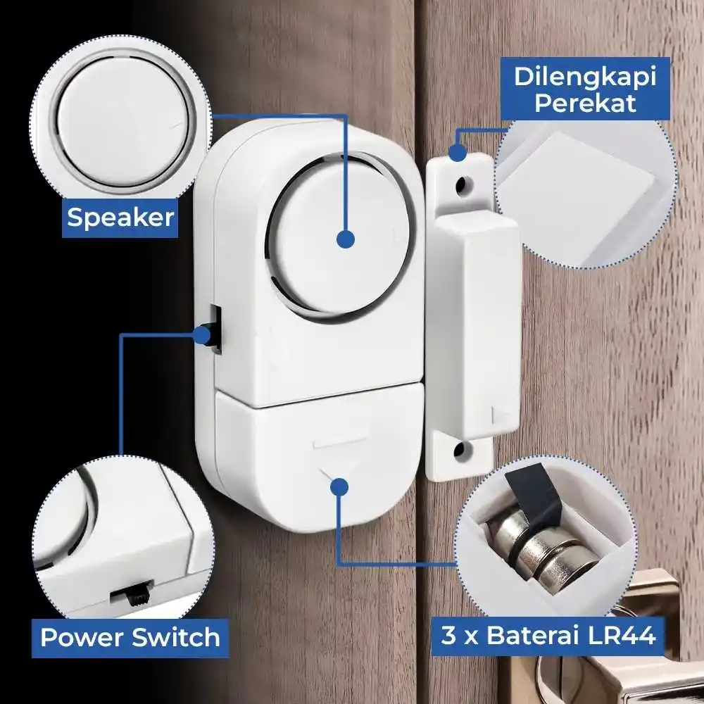 Alarm untuk Pintu atau jendela rumah ini menggunakan baterai LR44 3 buah (Sudah termasuk). Dapat dipasang pada pintu / jendela / laci / lemari, gudang dan lain-lain.
